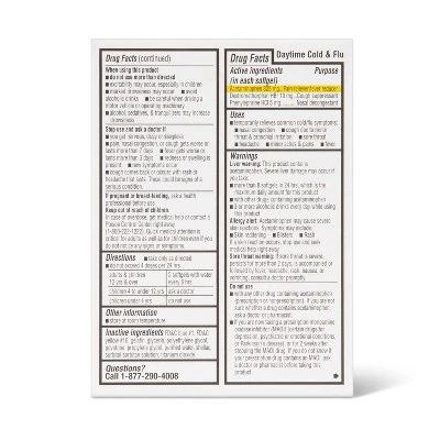 - NON-DROWSY DAYTIME COLD AND FLU MEDICINE provides multi-symptom relief of headache, fever, sore throat, nasal congestion, cough, and minor aches and pains.