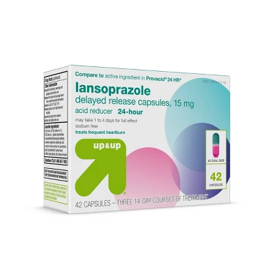 Compare to Prevacid 24 HR active ingredient. up & up Lansoprazole Delayed-Release Capsules 15 mg stops acid production at the source – the pumps that release acid into the stomach. In three clinical studies, lansoprazole 15 mg capsules were shown to be significantly better than placebo in treating frequent heartburn. Taken once a day (every 24 hours), every day for 14 days; may take 1 to 4 days for full effect. Take in the morning before eating. Experience life without heartburn.