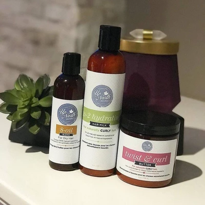 Step 1: Care for and style naturally curly hair with Up North Naturals cleanser, conditioners and styling products.