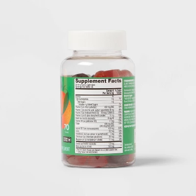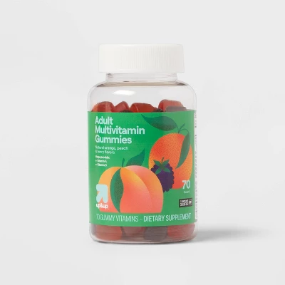 For an easy way to introduce vitamins to your day, these Fruit Flavors Multivitamin Gummies from up&up™ make a perfect pick. In a convenient container that includes 35 servings of 2 gummies per day, these adult multivitamin gummies help provide you with vitamin A, vitamin D and other vitamins and nutrients you need — all in an easy-to-eat gummy format. With natural orange, peach and berry flavors in the pack, these multivitamin gummies are gluten free, made with no artificial colors, flavors or preservatives, and do not contain any of the 8 major allergens. 100% Satisfaction Guaranteed.