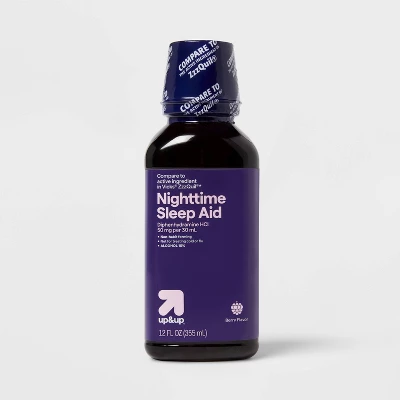 Compare to Vicks ZzzQuil active ingredient. Catch some Z’s with Up&Up Night Time Sleep-Aid Liquid, Mixed Berry Flavor. Up&Up Night Time Sleep-Aid Liquid relieves occasional sleeplessness and helps you fall asleep. This night time sleep medicine contains the active ingredient diphenhydramine HCl 50 mg per 30 mL, the number one doctor recommended sleep-aid active ingredient (of U.S. physicians surveyed by an independent market research firm). Non-habit forming liquid sleep-aid. Dosing cup provided. For adults and children 12 years and over. Gluten free. Not for treating colds or the flu.