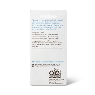 Clean screens and lenses effortlessly with this Microfiber Lens Cleaning Cloth from up&up™ This soft microfiber cloth makes a go-to and practical addition to your everyday life. Featuring a textured design, it easily catches and removes dirt, debris, grease, oil and other particles from your optical lens, screen or monitor. This handy multi-use cloth is machine washable and is great for repeated use. Plus, it can be used with or without lens spray for quick and hassle-free cleaning.100% Satisfaction Guaranteed. Cloth unfolded is 7″ x”7.